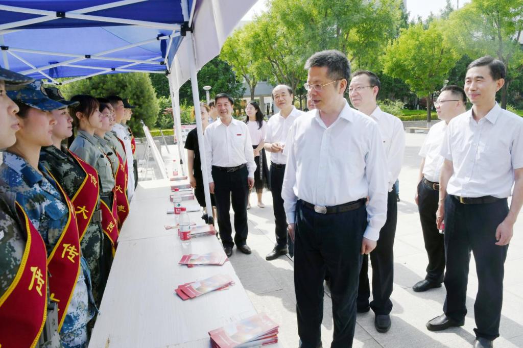 在毕业生征兵入伍宣传台前,方光华与best365官网退役复学学生亲切交谈,仔细询问学生参军入伍期间的体会和收获,赞扬他们胸怀家国天下,携笔从戎,希望他们回归母校后不忘初心,继续为国防事业贡献力量,在学习和工作中再立新功。