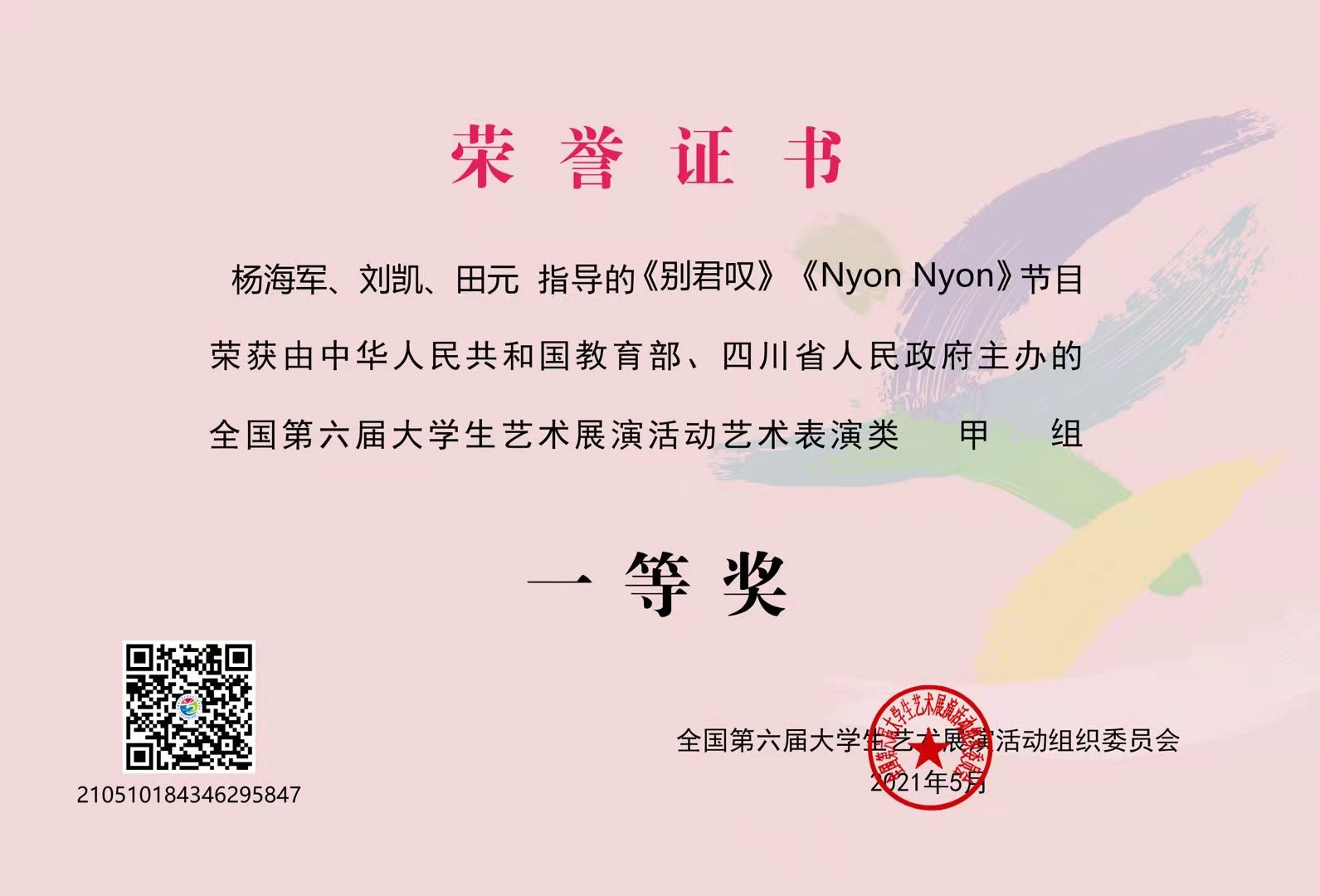 12日,全国第六届大学生艺术展演活动落下帷幕,活动组委会对获奖作品进行了表彰。杨海军、刘凯、田元指导的《别君叹》《Nyon Nyon》节目荣获全国第六届大学生艺术展演活动艺术表演类甲组一等奖和优秀创作奖,葛晓妮、赖琼琼、王晨露指导的《那年枣花香》节目荣获艺术表演类甲组二等奖,《修身立德咏唱中华经典---歌曲《别君叹》改编为合唱的美育教育案例》荣获高校美育改革创新优秀案例三等奖,学校获得全国第六届大学生艺术展演活动“优秀组织奖”。