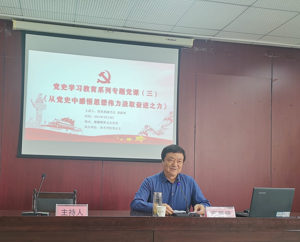 为深入学习贯彻落实《中共中央关于在全党开展党史学习教育的通知》和《best365足球官网关于开展党史学习教育的实施方案》文件精神,扎实推进美术学院党史学习教育走深走实,4月14日下午,校党委副书记栾高明在德勤楼第五会议室为美术学院师生党员讲授了《从党史中感悟思想伟力汲取奋进之力》的专题党课。美术学院全体师生党员参加了此次党课学习。