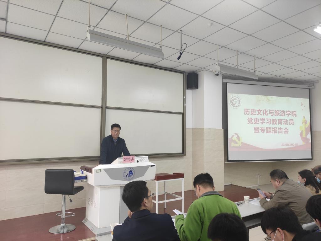 为深入学习贯彻习近平总书记在党史学习教育动员大会上的重要讲话精神,全面贯彻落实省委、省教育工委、校党委关于党史学习教育的部署和工作要求,推动党史学习教育走深走实,3月24日下午,历史文化与旅游学院在四教阶一教室召开党史学习教育动员部署会暨专题报告会,对学院党史学习教育进行动员和部署安排。学院党总支书记童广运做动员讲话,教育部人文社科重点研究基地——中国共产党革命精神与文化资源研究中心副主任、西安科技大学马克思主义学院硕士生导师裴恒涛教授应邀做党史学习教育首场专题报告。学院党政班子成员、各党支部书记和全体教师以及学生党员、积极分子、团学干部等100余人参加会议。副院长(主持工作)杜红艳主持会议。