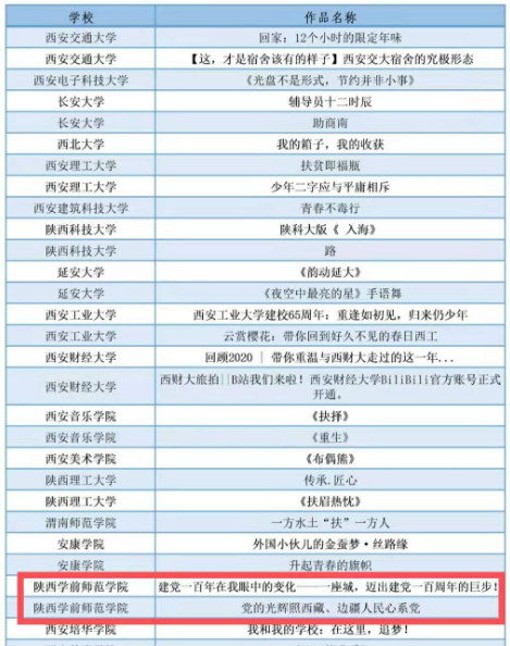 在“高校网络教育优秀作品推选展示活动”中,马克思主义学院提交的新媒体作品《青年学子讲四史》入选优秀工作案例推荐名单;推送的由学生执导的微电影《党的光辉照西藏、边疆人民心系党》和《建党一百年在我眼中的变化----一座城,迈出建党一百周年的巨步》入选优秀微电影推荐名单。