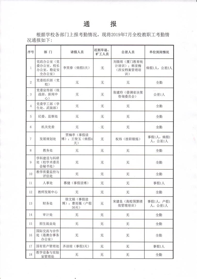 2019年7月教职工考勤情况通报