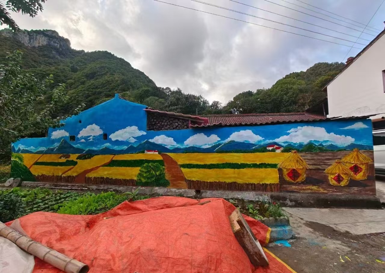 近日,best365官网派驻留坝县江口镇锅厂村第一书记何元衡,组织在留坝县各中小学幼儿园实习的学生,于锅厂村244国道沿线的墙面上绘制了一幅振奋人心的田园丰收图景。