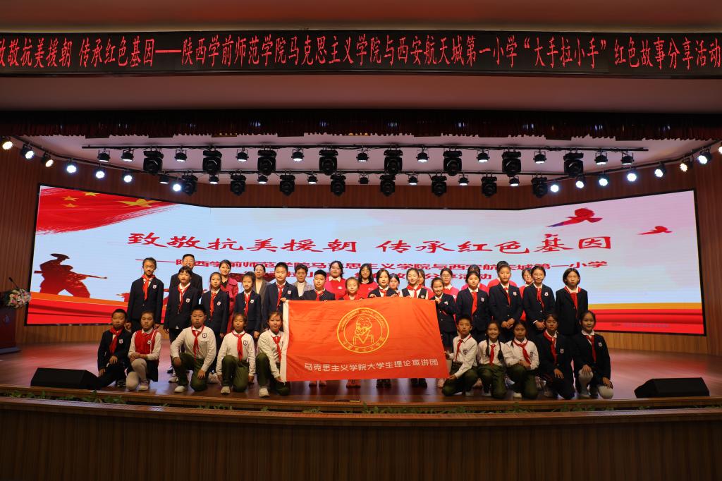 10月21日下午,“致敬抗美援朝,传承红色基因”——best365足球官网与航天城第一小学“大手拉小手”红色故事分享活动,在航天城第一小学举办。马克思主义学院党委书记高萍、思想政治教育系党支部书记冯瑛、航天城第一小学校长张军红、德育主任惠璇、大学生理论宣讲团成员、部分教师以及航天城小学300余名学生参加活动。