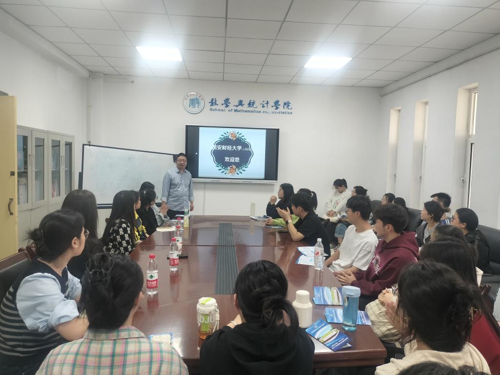 随后,罗清君教授一行人来到我院会议室,向考研学生详细介绍了西安财经大学数学学院的招生政策,包括数学学院的基本情况、培养方向、招生专业、初试复试科目以及研究生奖助补助政策等四个方面内容,全面展示了西安财经大学数学学院的优势与特色。罗清君老师详细的介绍了数学学科在研究生期间的学习、生活情况和就业前景,并对在场学生提出的问题逐一进行耐心的解答。