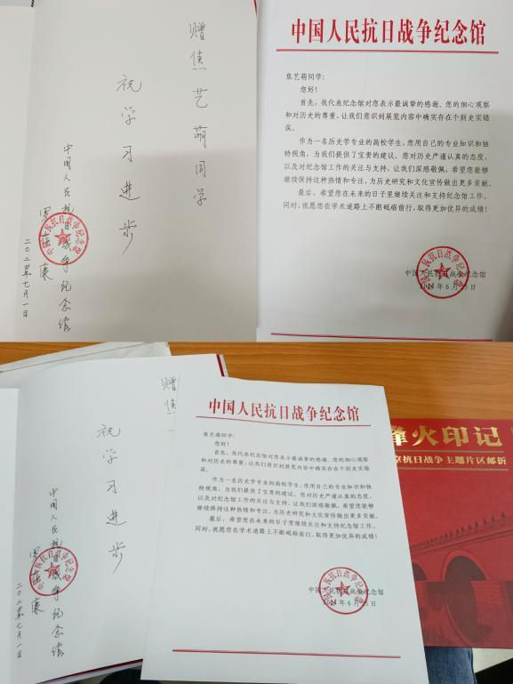 7月4日,历史文化与旅游学院焦艺萌同学收到了来自北京的邮包,包裹中不仅有一封感谢信,还有罗存康馆长亲笔签名的纪念画册以及极具纪念意义的邮折。中国人民抗日战争纪念馆在信中表达了对焦艺萌同学指出史实标注错误的的感谢,并赞扬焦艺萌同学对待历史态度严谨认真,鼓励她在学术道路上砥砺前行,取得更加优异的成绩。
