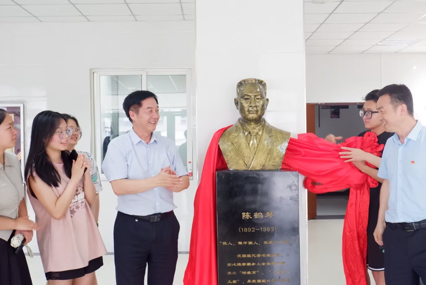 邵书记为陈鹤琴先生雕塑进行揭幕。该雕塑由底座和人像两部分组成,正面雕刻“一切为了儿童”六个字。陈鹤琴先生提出要培养学生具有敬业、乐业、专业、创业的精神、创建了“活教育”的理论体系。陈鹤琴先生塑像的落成是幼儿教育学院文化建设的又一重要成果,希望它能成为学院文化的灵魂核心,也期待广大同学按照党、国家和人民的要求,树立积极进取的人生观,把握自我努力的方向,培养自强不息的精神,努力学习锻炼,健康成长为新时代的“四有”好幼师。