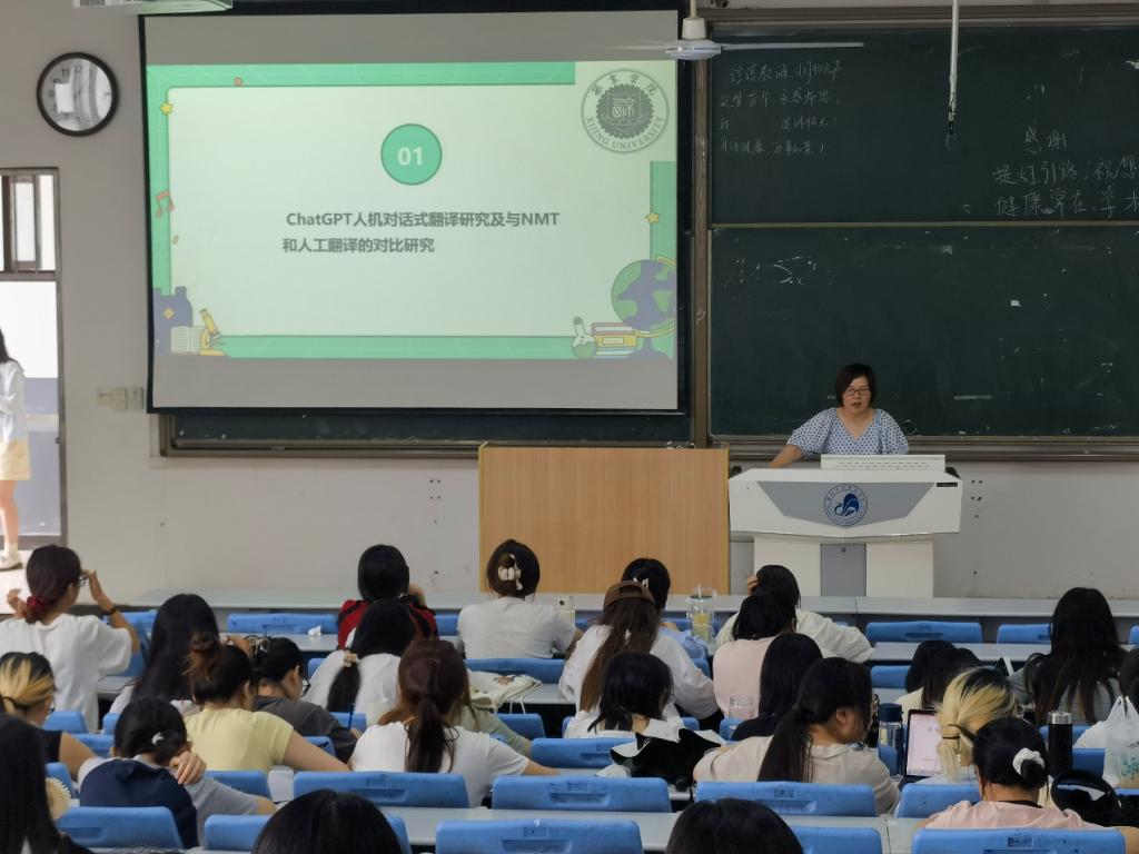董老师首先以问题“随着机器翻译效率和质量的提高,人工翻译将会被取代吗?翻译专业的毕业生就业令人堪忧?”开场,学生们带着疑惑和问题聆听讲座。