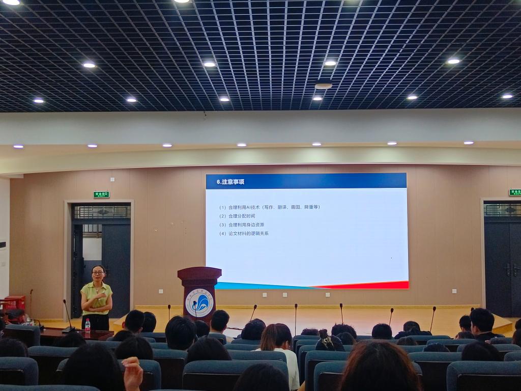 第三场报告《数学类学术论文写作指导》由我院丁剑洁教授主讲,内容主要涵盖了论文如何选题,基础数学、应用数学、数学教育不同类型论文的写作要求;如何在教育实习中通过调查问卷、实验测验为毕业论文收集数据;合理使用AI技术、处理好考研准备、教育实习、论文写作之间的关系等注意事项。报告为21级数学与应用数学专业学生的毕业论文写作奠定了良好的开端,进一步充实了教育实习的内容。