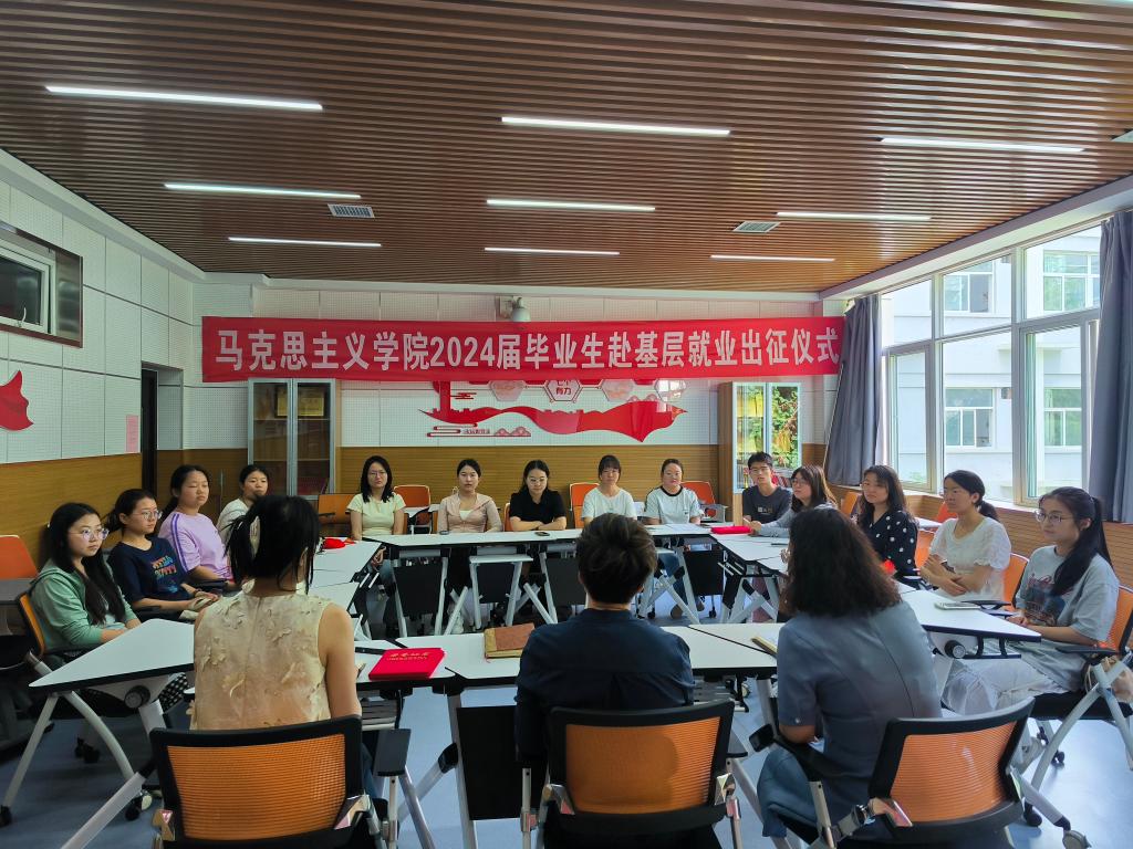 为热烈欢送即将赴基层就业的2024届毕业生,进一步鼓励引导更多学生了解基层、选择基层、奉献基层,6月28日,马克思主义学院举行“扎根基层 绽放青春”2024届赴基层就业毕业生出征仪式暨毕业生代表座谈会,学院党委书记高萍、副书记白艳、辅导员陈茜和赴基层就业的学生代表参加了仪式。