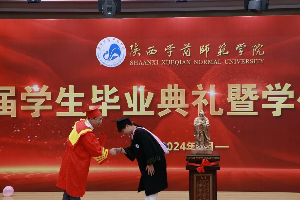幼儿教育学院副院长范铭、张亚妮分别宣读了《关于准予李若兰等753名学生毕业的决定》、《关于拟授予李若兰等753人教育学学士学位的决定》,与会领导为毕业生代表赠送毕业留念礼物——一枚刻有院徽和院训的姓名印章,同时颁发了毕业证书。2020级优秀毕业生刘德华带领全体毕业生面向院旗庄严宣誓:用智慧和才华肩负起民族复兴的使命;用青春和热血承担起国家富强的责任。今天我以陕师院为骄傲,明天陕师院以我为自豪。