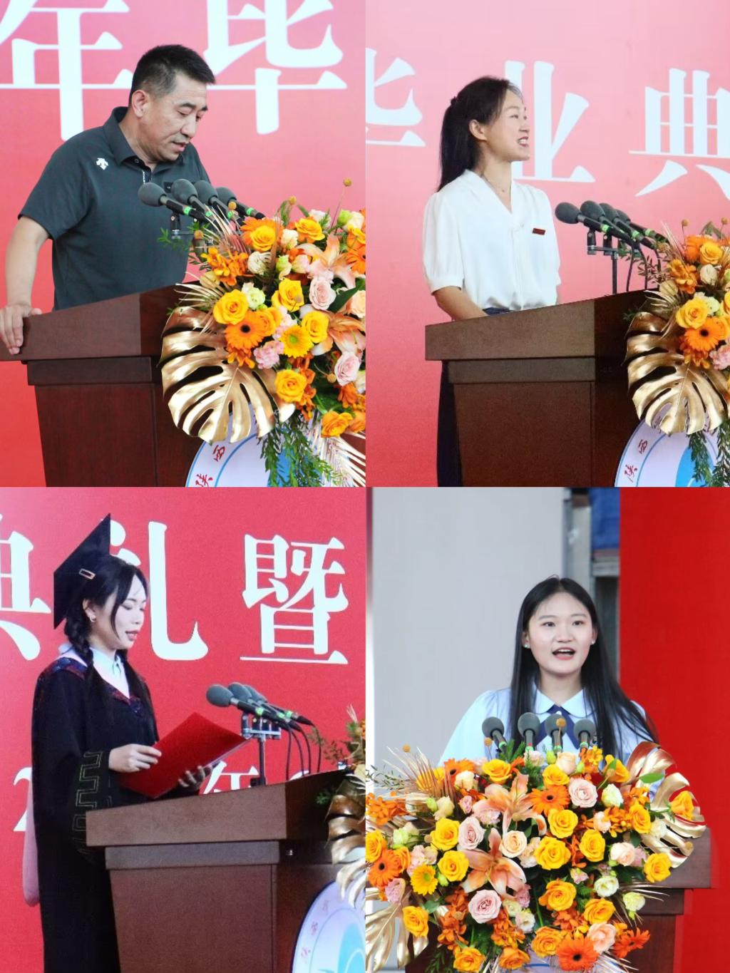 2022—2023学年院学生会主席、2020级本科二班史卓同学作为优秀毕业生代表发言。她们回顾了自己在幼儿教育学院的学习和生活经历,感谢了学院领导、老师和同学们对自己的关心和帮助,表示了自己对幼儿教育事业的热爱和信心。2023—2024学年院学生会主席、2021级本科八班李怡欣同学作为在校生代表发言,表达了自己对即将离校的学长学姐们的敬佩和祝福,表示了自己对幼儿教育学院的热爱和自豪,承诺了自己要继续努力学习,为毕业生们争光添彩。梁嘉琪同学的家长作为毕业生家长代表发言。她感谢学院对毕业生们的培养和关怀,祝福毕业生们能够在未来的工作和生活中取得更大的成就和幸福。