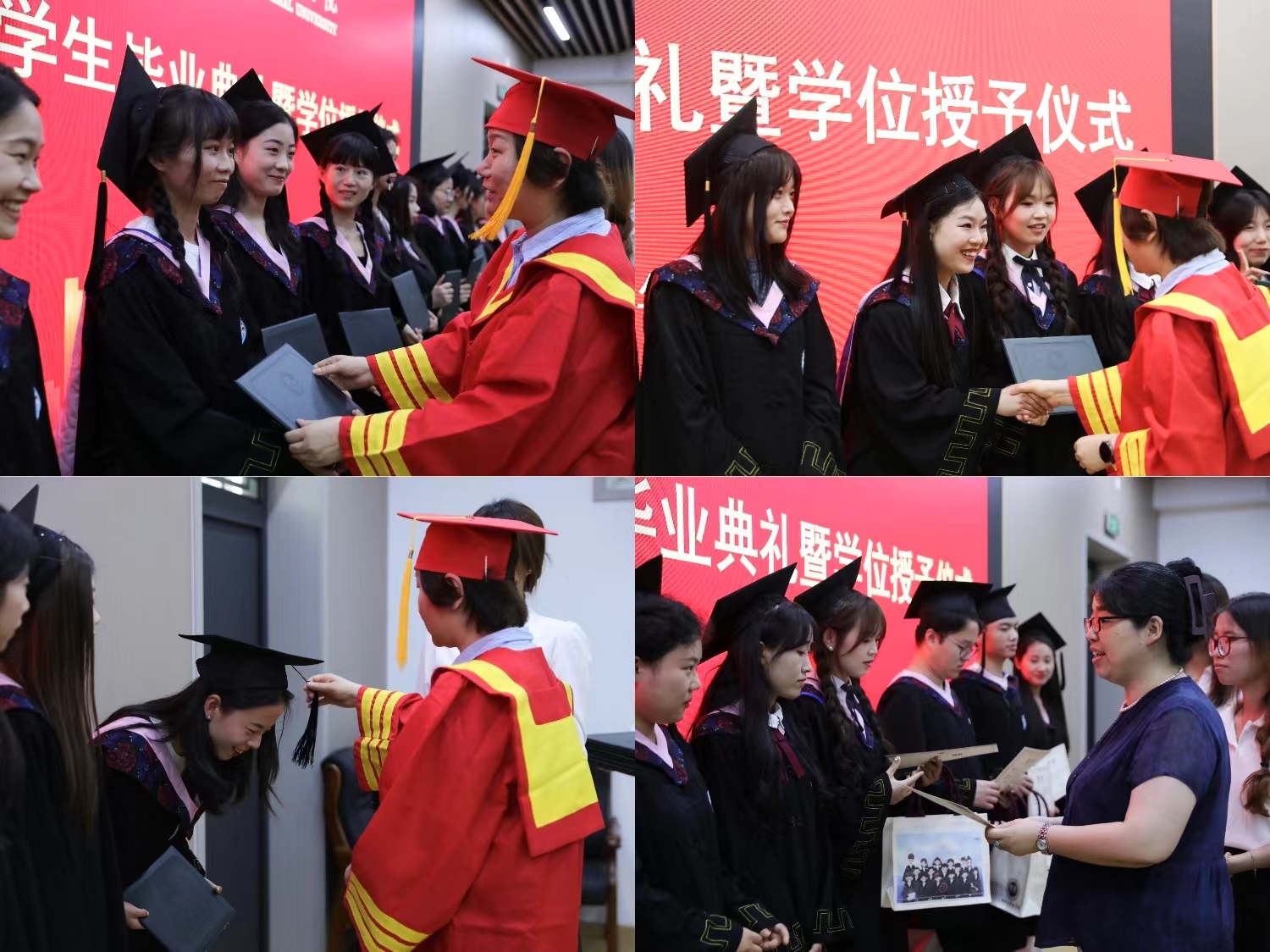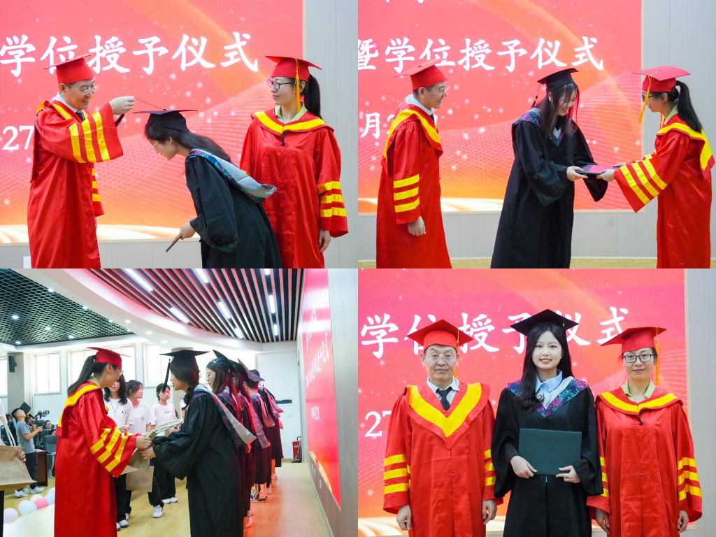 随后,开始学位授予仪式。全体毕业生依次上台,院长为他们拨穗正冠、授予学位证书,并合影留念。