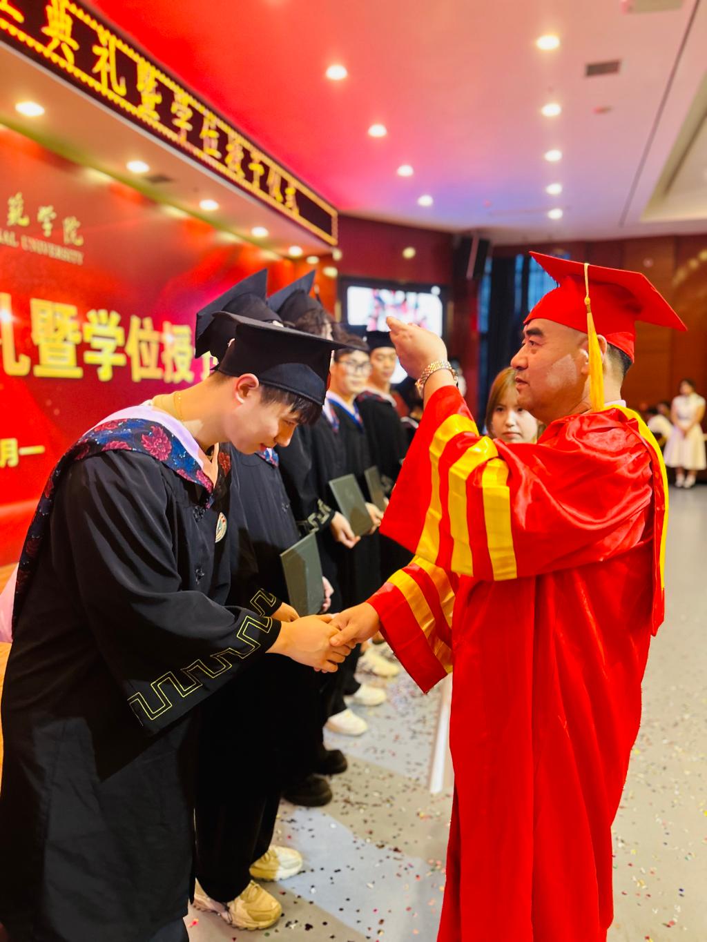在庄严的学位授予仪式上,幼儿教育学院学委委员会的全体教师为现场参加学位授予的毕业生们颁发学位证书并扶正流苏。毕业生们向老师深深鞠躬,接过沉甸甸的学位证书,激动而兴奋。最后,毕业典礼在全体毕业生合唱的歌曲《稻香》和《起风了》落下帷幕,毕业生通过歌曲表达了他们对人生新起点的希望憧憬与对母校深深的不舍之情。仪式结束后,同学们有序离场,纷纷与老师们合影留念,留下了毕业季最美好的回忆。