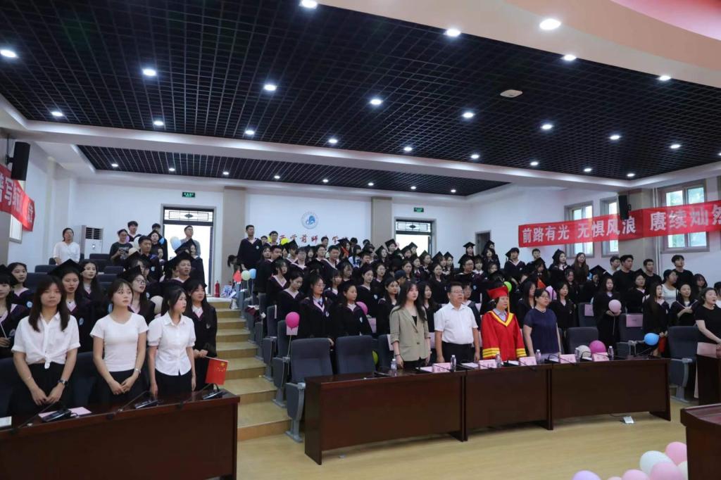 典礼开始,全体起立,奏唱国歌。恢弘的旋律、嘹亮的歌声更增添毕业生的爱国荣校情怀。