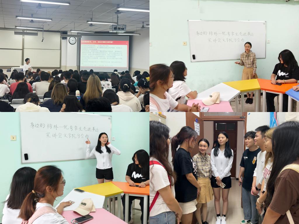 5月29日,文学院在智慧楼阶3教室组织开展“学长讲堂”“国奖零距离”“励志筑梦人”“榜样面对面”“退役风采展”主题宣讲会。2021级、2022级、2023级共计200余名学生参与。会议由辅导员王彩旭老师主持。