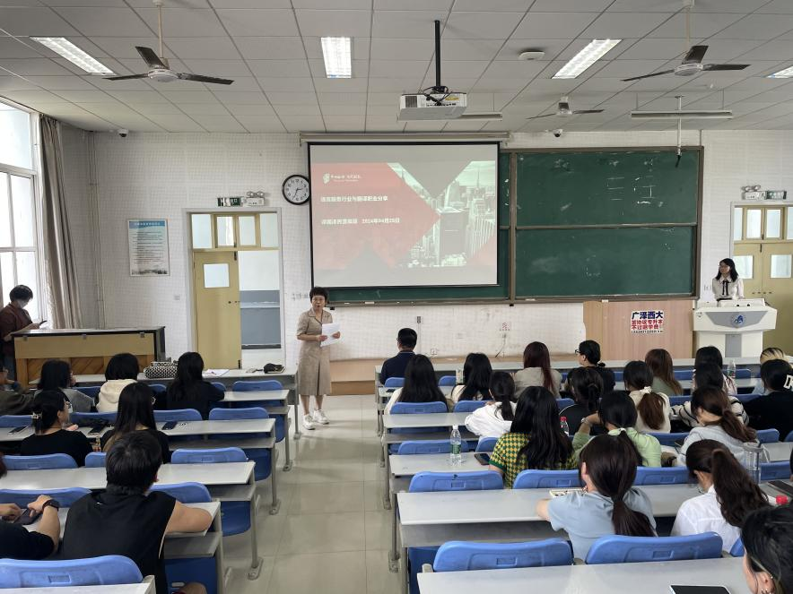 2024年4月25日下午,译国译民集团雷良琼总经理应邀参加外国语学院“英华语译通讲堂”第11期讲座,做了一场题为《翻译行业与翻译职业》的专题报告。外国语学院2020级、2021级以及2022级翻译专业近百名本科生与我院翻译系部分教师到场参加活动,报告由张慧军院长主持。