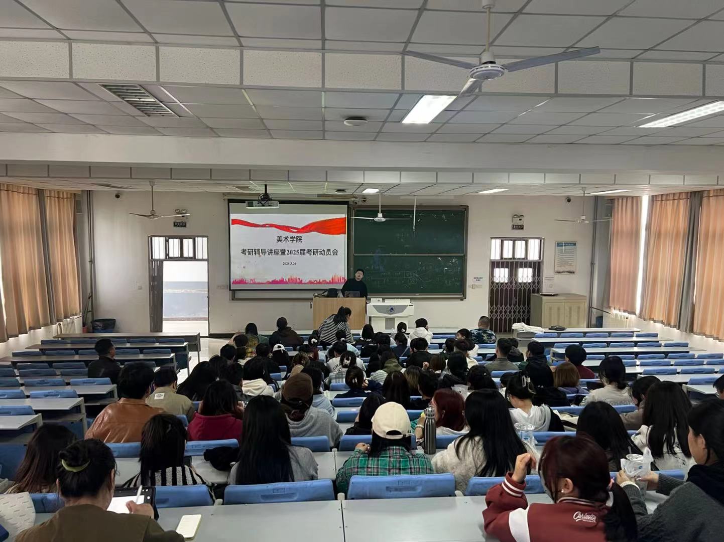 为营造积极向上的学风,提高学生的考研热情,明确考研目标,树立考研自信心,促进考研学生应试技巧的提升,美术学院分别于3月26日、27日下午在1教c2教室开展了2025届毕业生考研动员大会暨考研指导讲座。会议由美术学院副院长王希主持,邀请了黄土画派美术博物馆执行馆长张子麟、考研专家任蹦蹦老师做考研规划和应试技巧报告。2024届备考研究生复试毕业生及2025届有意向备考研究生考试的同学参加本次讲座。