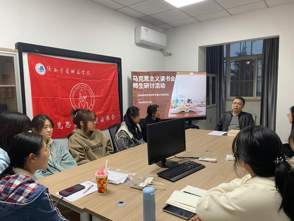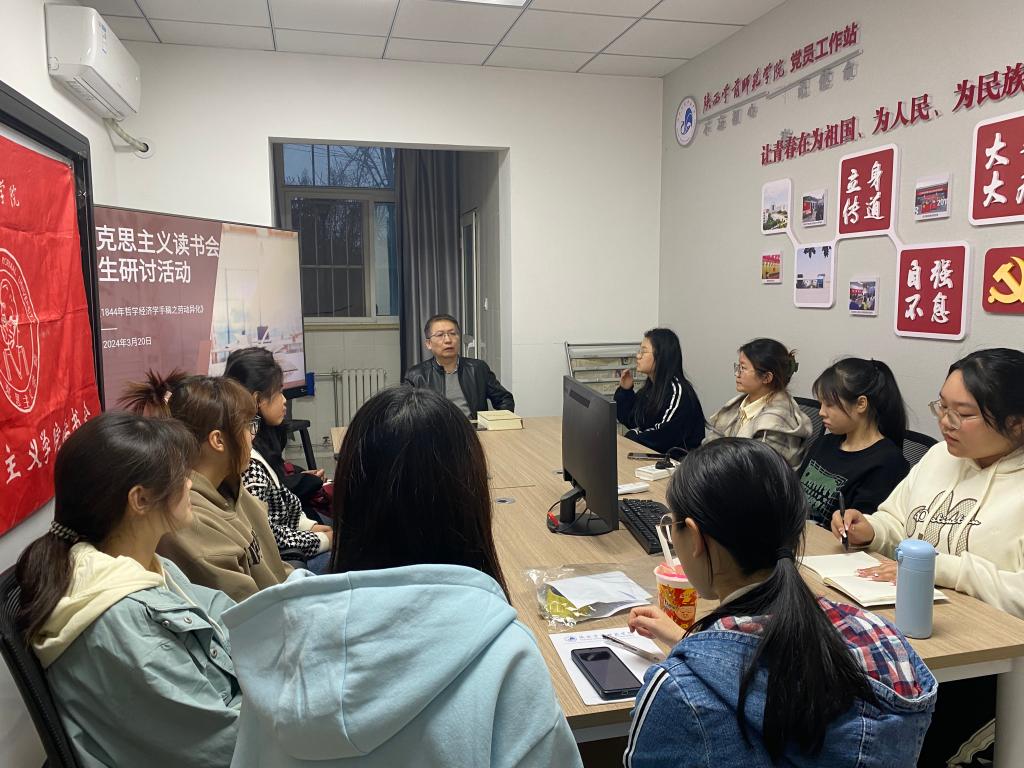 本次读书分享会的主题是马克思《1844年经济学哲学手稿》中异化劳动理论,分享会由马克思主义学院副院长王锦东老师主持。他从历史背景出发,系统梳理了马克思《1844年经济学哲学手稿》中阐述的异化劳动概念,指出劳动作为人的类本质在资本主义生产关系下所发生的异化现象,并就异化劳动如何导致工人与其产品、劳动活动本身以及人与人的关系发生疏离进行了深入剖析。随后师生们围绕异化劳动理论的价值展开了热烈讨论,探讨这一理论对于构建和谐劳动关系、推动社会公正和促进人的全面发展等方面的启示作用。