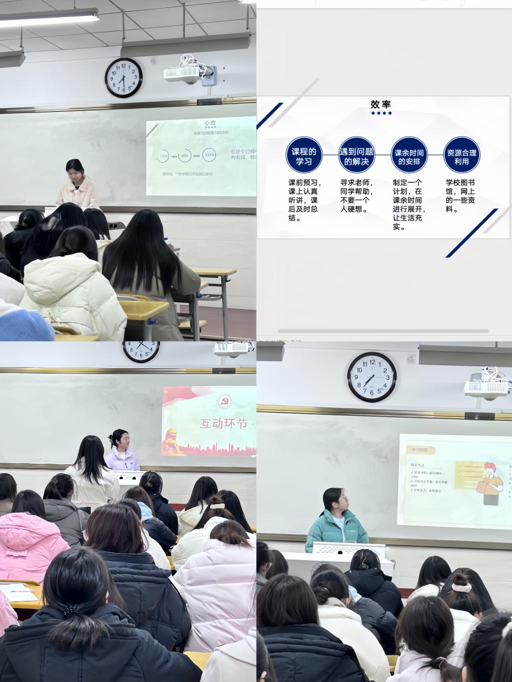 我院三位优秀学子周红瑞、张佳静和齐怡欣结合自己的生活、学习,分别从如何确定学习目标并做好学习计划、坚持是成功的唯一捷径、制定学习计划实现人生目标三个方面,与大家分享了自己在成长路上的宝贵经验和心得感悟,并鼓励大家做人、做事一定要专注、勤奋、坚强。三位优秀学子与同学们进行了充分的互动,并解答了“参加活动和竞赛时如何平衡时间”“高中与大学的学习是否一样”等问题,提醒大家大学的学习靠的是自律、自觉、自信和坚持。
