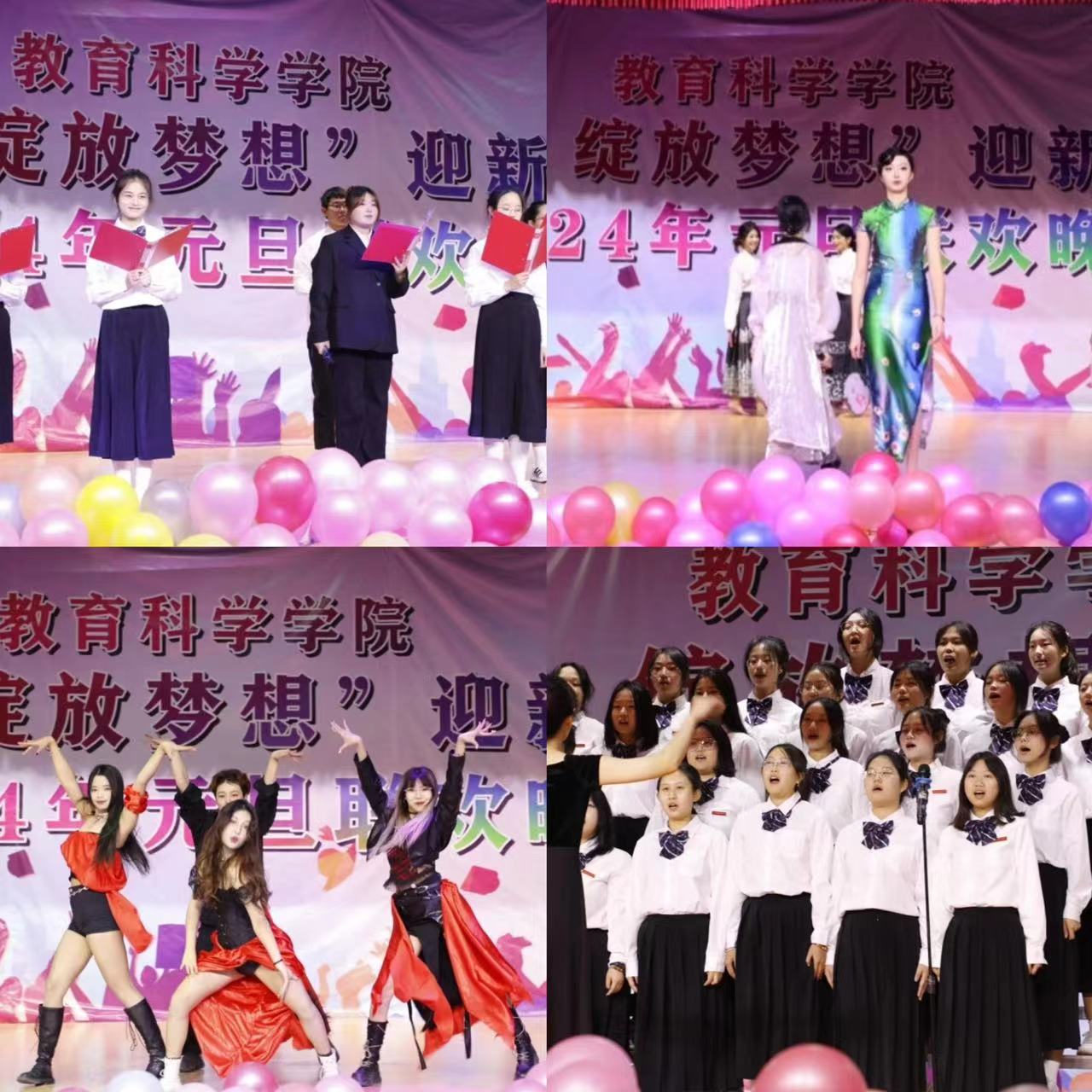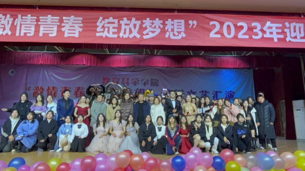 新元肇启,华章日新。挥别砥砺奋进的2023年,我们迎来了充满希望的2024年。在这辞旧迎新的时刻,2023年12月19日19点教育科学学院在大学生活动中心成功举办了“激情青春 绽放梦想”迎新文艺汇演暨2024年元旦联欢晚会。学院党政领导和部分教师以及全体学生到场共同观看本次盛典,晚会现场师生欢聚一堂,在欢声笑语中许下对新年的祝福。