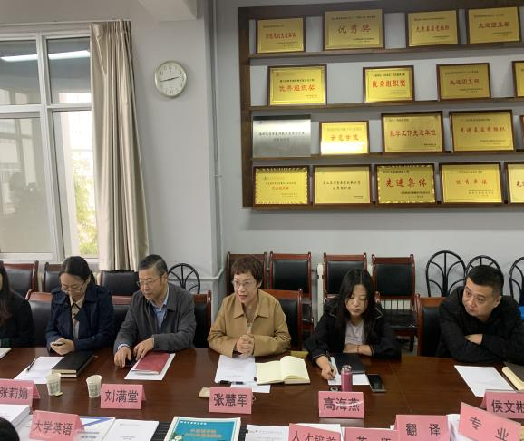 张慧军教授对我院的总体情况从历史沿革、师资队伍、专业建设、学科发展、人才培养及成效、教师获奖等方面做了介绍;张莉娟副院长从课堂教学开展、教学质量监控、教学资料整理等方面进行了详细的说明;王雨副院长就大学英语教学改革、分级教学的实施及成效进行了说明;高海燕书记和侯文彬副书记分别就党风廉政建设,师德师风建设,学生管理,特色品牌活动开展、学生指导等方面进行了全方位的介绍。马庆林院长对外国语学院在教师获奖、一流专业建设、特色品牌活动开展和学生专业指导等予以充分的肯定。他也从发展历史、师资队伍建设、人才培养、特色凝练、一流课程建设、品牌活动开展等对文化传播学院的情况做了介绍。