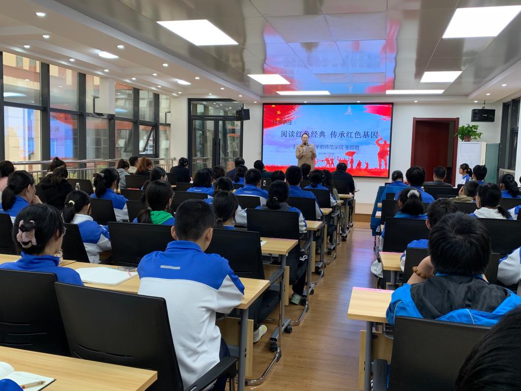 第三部分由马克思主义学院教师王丽君作了关于《阅读红色经典 传承红色基因》的科普主题讲座。讲座主要围绕红色经典著作的阅读对于传承红色基因的重要性、中学生传承红色基因的有效途径与创新发展红色教学资源的使用途径三个方面展开。