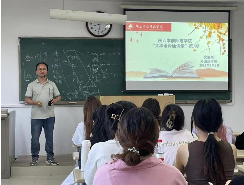 2023年9月5日,best365足球官网外国语学院举办“英华语译通讲堂”第7期讲座,主讲嘉宾为中国国学双语研究会会员、陕西译协理事、西京大学史潘荣老师。史老师结合汉英笔译实践翻译任务,对翻译主体、翻译方法、翻译类型、翻译目的等方面进行了针对性讲授,21级、22级翻译系全体本科生在现场聆听报告。讲座由翻译系主任吴迪老师主持。