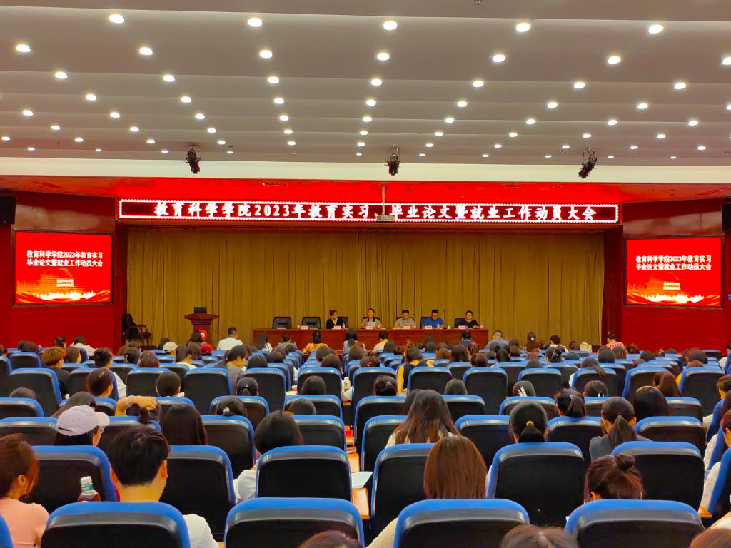 为启动并扎实推进教育科学学院2024届毕业生教育实习、毕业论文和就业工作,规范管理学生的教育实习和毕业论文工作,提高教育实习和毕业论文的工作质量。同时,为指导2024届毕业生提前做好就业规划,引导毕业生为求职就业做好充分准备。教育科学学院于2023年9月6日下午在图书馆东侧三楼学术报告厅召开2023年教育实习、毕业论文暨就业工作动员大会。出席此次动员大会的有校党委学工部薛晓娟部长、学院党政领导、全体专业教师、毕业班辅导员老师及2024届全体毕业生。会议由潘炳超副院长主持。