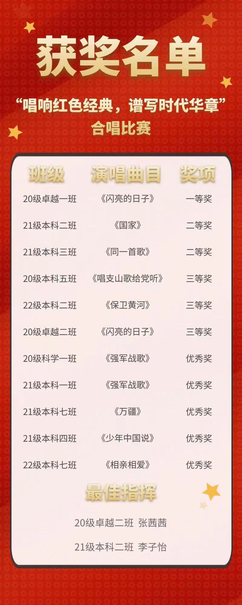 十五支参赛队伍,在精彩的演绎中展现红色经典,讴歌革命先辈不屈不挠的奋斗精神。经评委老师打分,最终评选出一等奖1名,二等奖2名,三等奖3名,优秀奖9名,最佳指挥两名,获奖名单如下。