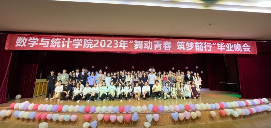 毕业季,迎“七一”。在全校上下学习贯彻习近平新时代中国特色社会主义思想主题教育之际,为了庆祝2023届毕业生顺利毕业,营造温暖和谐的毕业季氛围,传递母校对毕业生诚挚的祝愿,6月30日,数学与统计学院在大学生活动中心隆重举办“舞动青春 筑梦前行”2023届毕业晚会。学院师生近300人参加了晚会。