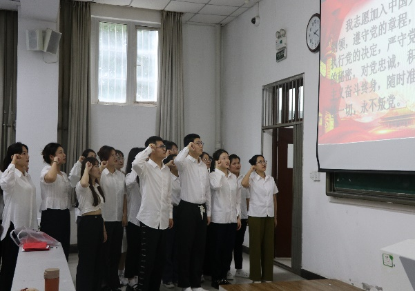 随后,在新发展党员入党宣誓仪式上,新党员列队整齐,由老党员为新党员佩戴党徽,激励他们不忘初心,砥砺前行,把党的光荣传统和优良作风铭记于心、践之于行,实现党的事业薪火相传。新党员面对党旗庄严宣誓,要始终保持对党绝对忠诚,坚定理想信念,忠于党的事业。2021级学生邱瑞代表新发展党员发言,表示了对党组织培养和教育的感激之情,也表明了“做合格党员,永远跟党走”的信心与决心。2020级学生党员董子业、于杰分别代表老党员发言,号召大家要不断武装头脑,增强党性修养,严于律己,继承和发扬党的优良传统,以良好表现回报党组织的培养和关怀,真正发挥党员的先锋模范作用。最后,庞曦副书记对党员们提出要求:一是要以认真落实政治理论学习为基础,牢记身份,做党的创新理论坚定的学习者和践行者;二是要以坚持中国共产党的领导、坚持走中国特色社会主义道路为根本,深刻理解坚持党的领导是中国特色社会主义最本质的特征;三是要以全心全意为人民服务这一宗旨为行动指南,积极服务群众、奉献社会。