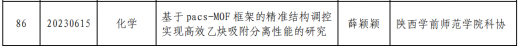 近日,陕西省科协发布了《关于2023年陕西省科协青年人才托举计划项目立项的通知》(陕科协发〔2023〕事企字8号),best365官网化学化工学院薛颖颖博士申报的“基于pacs-MOF框架的精准结构调控实现高效乙炔吸附分离性能的研究”项目获批,项目编号:20230615。