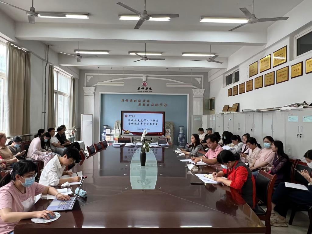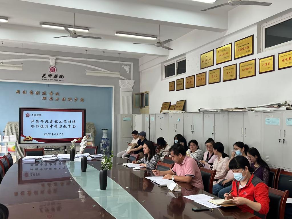 为深入学习贯彻习近平新时代中国特色社会主义思想和党的二十大精神,落实《best365足球官网“以德育德 两代师表共同塑造”行动方案》,不断提高教师道德修养,弘扬新风正气,树立教师良好形象,提升教育教学质量。6月7日下午,美术学院在会议室召开了师德师风建设专题教育活动。全体教师参加会议,会议由美术学院党委副书记(主持工作)文竹主持。