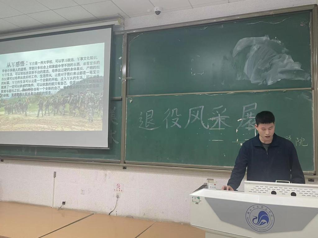 为宣传大学生参军入伍政策,激发学生们报效祖国、献身国防的热情。4月25日,美术学院在积学楼C2阶梯教室开展了“退役风采展”主题宣讲活动。由优秀退役士兵美术学院2021级美术学院二班张龙龙同学担任主讲。张龙龙同学分享了应征入伍的经历与收获,展示他在部队的风姿和丰富多彩的军旅生活,并向同学们详细讲解了大学生应征入伍的流程和优惠政策。同学们认真听讲,了解参军入伍政策,鼓励同学们积极响应国家号召,携笔从戎,参军报国,勇作新时代的弄潮儿,投身到军队和国防建设中去。