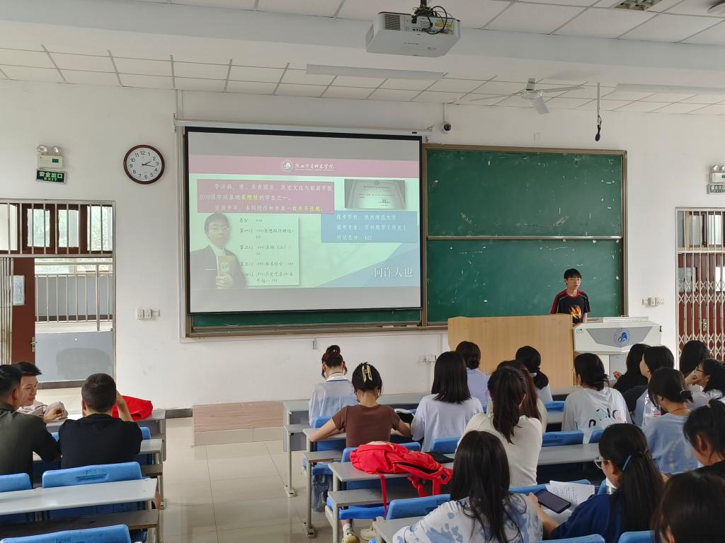 【历史文化与旅游学院】为进一步发挥优秀学生的示范和引领作用,教育和引导广大学生努力学习,奋发拼搏,树立理想信念,练就过硬本领,历史文化与旅游学院于近期集中开展了“身边的榜样”系列宣讲活动。宣讲人包括我院退役士兵,励志奖学金获得者,考研成功学生,从不同层面展现了我院优秀学生的风采。
