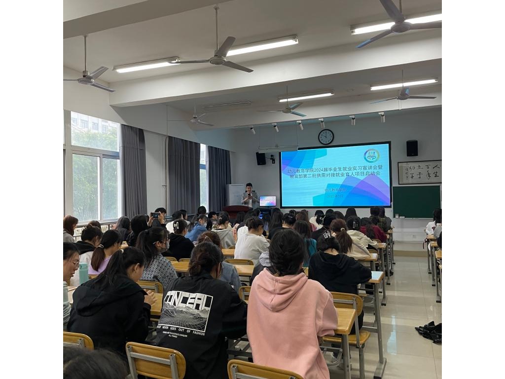 为稳步推进项目实施,确保项目顺利落实。2023年5月29日上午9:00,在学前教育楼315多功能厅,幼儿教育学院召开了2024届毕业生就业实习宣讲会暨教育部第二批供需对接就业育人项目启动会。本次会议专程邀请北京京师雅智教育科技有限公司幼教中心主任杨友振前来宣讲。幼儿教育学院2024届有去北京就业实习意愿的100多名学生和学工办主任程旭楠,辅导员孟嘉慧和周胜男参加了会议。会议由幼儿教育学院党委副书记(主持工作)王继康主持。