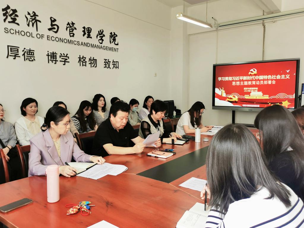 全党深入开展学习贯彻习近平新时代中国特色社会主义思想主题教育,是党中央为全面贯彻党的二十大精神的重大举措,也是深入推进新时代党的建设伟大工程的重大部署。2023年4月19日下午,经济与管理学院于博文楼B座411会议室召开学习贯彻习近平新时代中国特色社会主义思想主题教育动员部署会。经济与管理学院党委书记张建辉作动员讲话,学院全体教职员工参加会议。