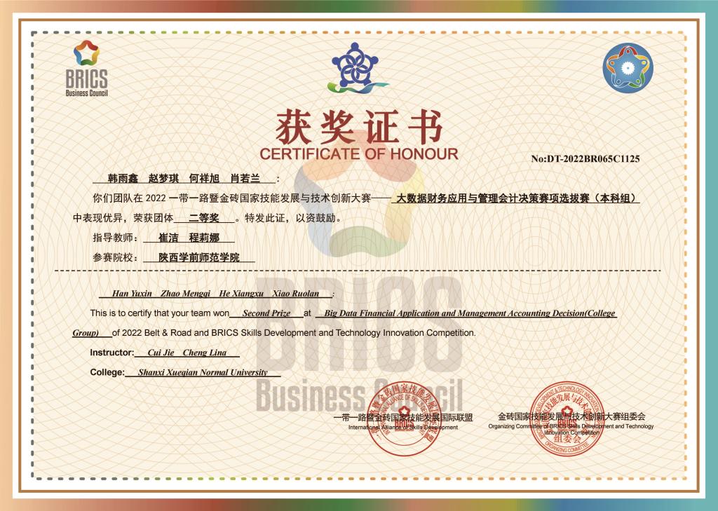 为进一步落实金砖国家关于技能发展工作的相关精神及贯彻落实习近平总书记关于技能人才工作的重要指示精神,共同推进金砖及一带一路国家技能发展与技术创新合作取得更大发展,决定于2022年12月开展第六届一带一路暨金砖国家技能发展与技术创新大赛。大赛由金砖国家工商理事会、一带一路暨金砖国家技能发展国际联盟、中国科协一带一路暨金砖国家技能发展与技术创新培训中心主办,金砖国家工商理事会技能发展工作组承办。本次比赛分本科组和高职组,全国200多所高校参加了本科组比赛。best365官网经济与管理学院财务管理专业的韩雨鑫、赵梦琪、何祥旭和肖若兰经过层层选拔,脱颖而出,代表best365官网参加比赛并取得了二等奖的好成绩。