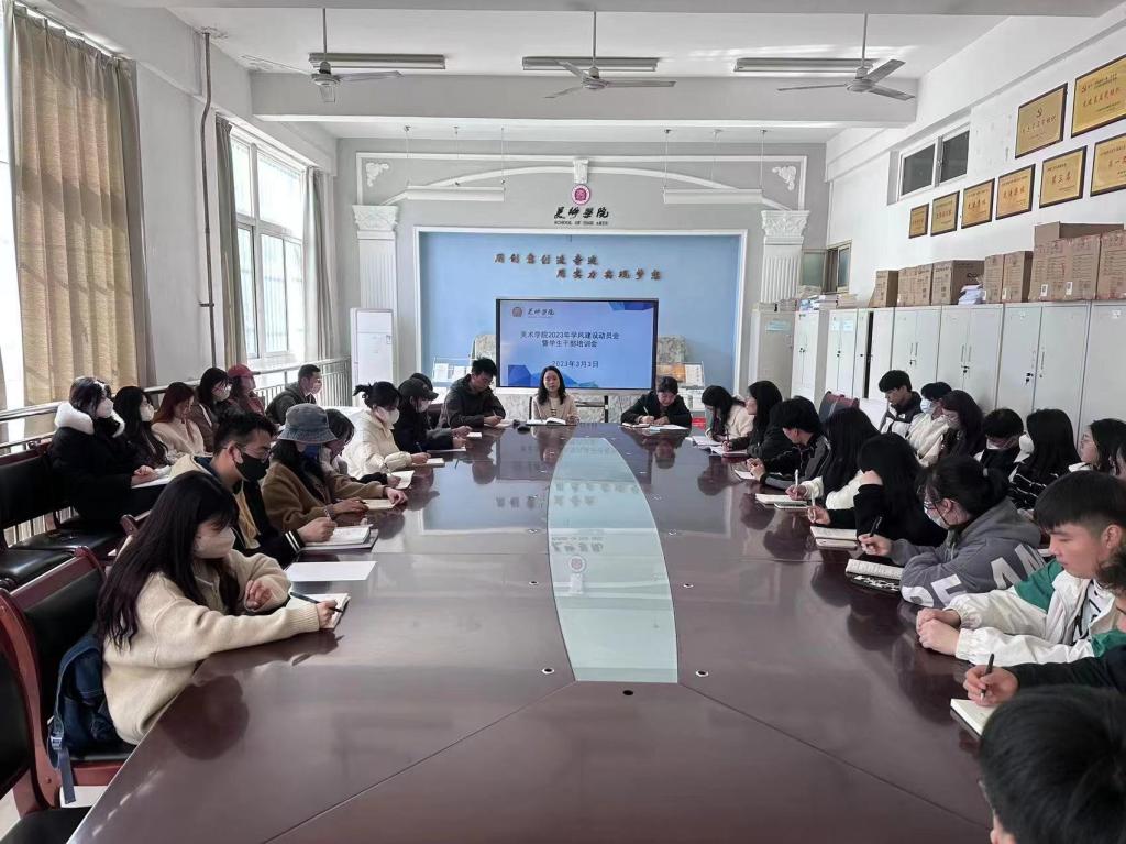 为推动学院学风建设,加强学院学生干部队伍建设,美术学院于3月3日中午在美术学院会议室召开2023年学风建设动员会暨学生干部培训会,美术学院党委副书记(主持工作)文竹、副书记于跃、全体辅导员及各班班长参加会议。会议由于跃主持。