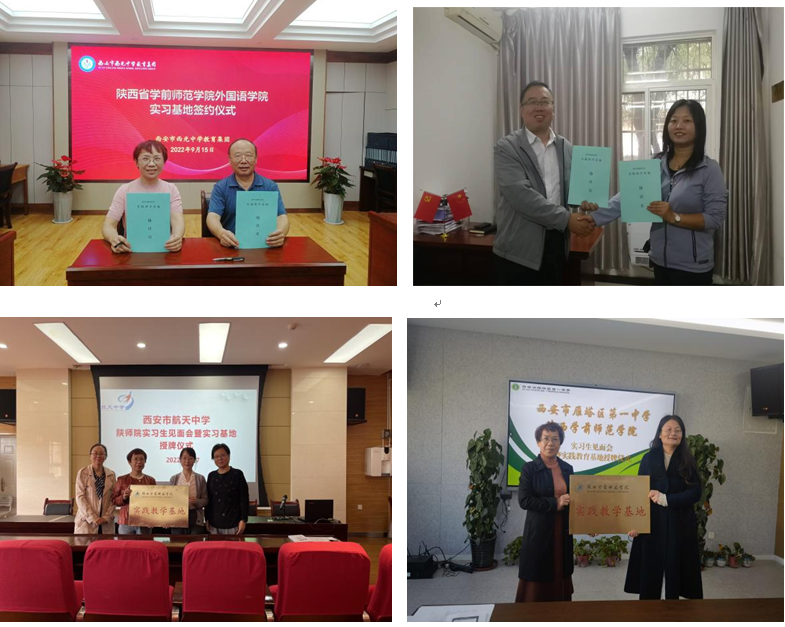 为进一步提升人才培养质量,充分开发和利用更多的优质资源,为学院的实践教学和学生的实习实践搭建良好平台,外国语学院积极行动,联合新城区教师进修学校,拓展优质教学实践基地。本年度,在巩固好已有实习基地的基础上,学院分别与师资力量强、教学质量高的西安市航天中学、西安市西光中学、西安市昆仑中学和西安市雁塔区第一中学等6所中学签订实践教学基地协议并挂牌。优质教学基地的进一步拓展,为落实U-G-S三位一体协同,培养高质量师范生提供了保障。
