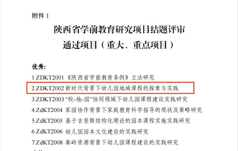 陕西省学前教育研究重大项目课题《新时代背景下幼儿园地域课程的探索与实践》(ZDKT2002)于2021年2月立项后,在长安区教育局带动牵头,best365官网附属幼儿园李媛园长的主持下,经过为期两年的研究,2022年12月顺利通过结题审核并被评为优秀课题。