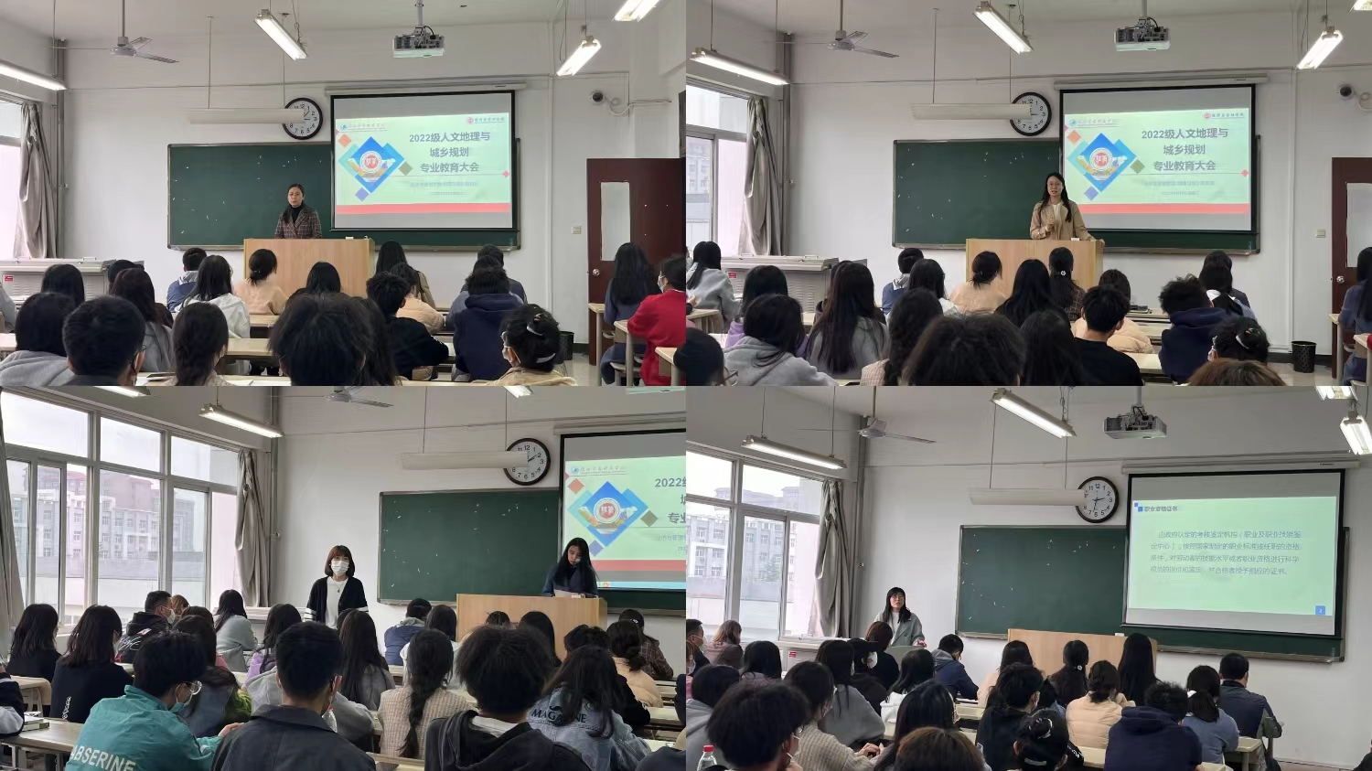 会上,地理与城乡规划系主任徐晗老师、青年教师贾凌云等依次为新生们详细介绍了人文地理与城乡规划专业的师资力量、专业特色、人才培养方案、专业规划、发展前景、资格证书考取等一系列重要内容,希望帮助学生们对本专业有更加全面的了解,树立专业信心,做好学习规划。随后,学院党委副书记陈璐进行了发言,她希望同学们在新的环境中能努力学习,不断奋进,争做德才兼备、知行合一的新时代好青年。会议由学院副院长陈秀端进行总结,她希望2022级的新同学们能够保持积极的心态,学好专业知识,掌握专业技能,勇于探索、敢于尝试,为收获更好的自己而努力拼搏。
