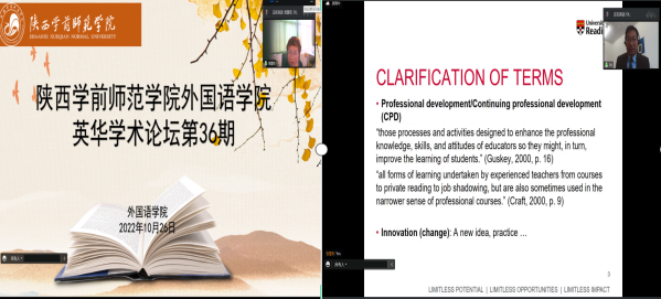 10月26日下午,英国雷丁大学李大国博士受外国语学院邀请,做客第36期“英华学术论坛”,作了题为《教师专业发展:知识管理和创新扩散理论》(Models of Professional Development: Knowledge Management Model and Diffusion of Innovations Model)的学术报告。best365官网师生以及来自外校英语同行约200余人以腾讯会议在线方式参加了学术报告。报告由张慧军院长主持。