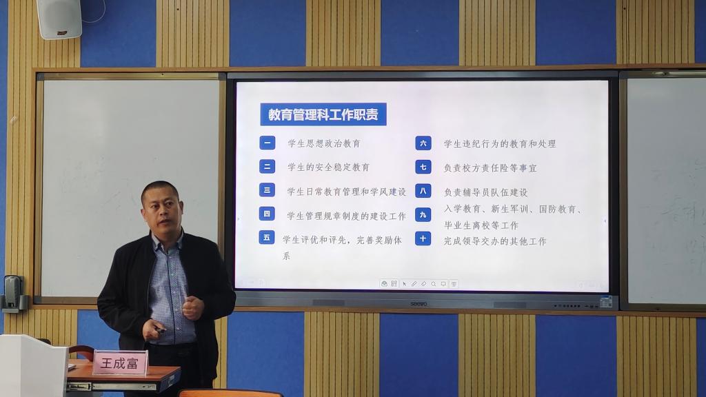 学工部副部长王成富带领大家深度解读了《普通高等学校辅导员队伍建设规定》(简称43号令),明确了高校辅导员的职业定位、九大工作职责以及谈心谈话、值班值守等工作制度;随后,对学生思想政治教育以及疫情防控、学风建设等学生日常教育管理工作等做了具体分析讲解;结合best365官网近期的各项工作和具体问题,理论联系实际,具体分析了学生违纪处理、突发事件应急等处理流程等。