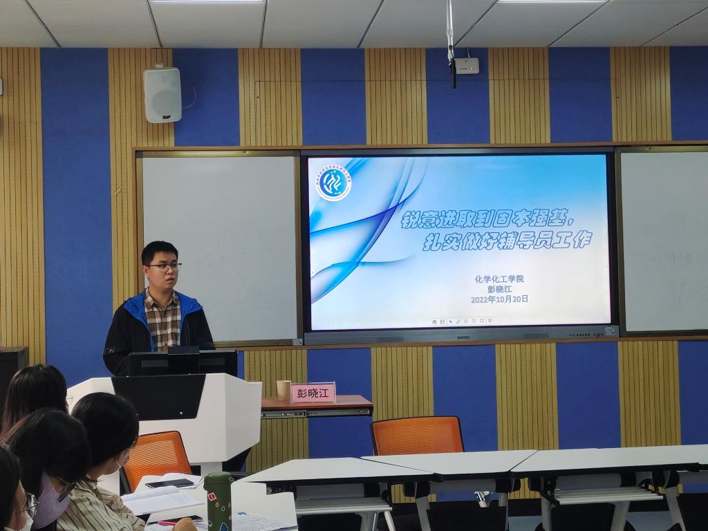 化学化工学院党委副书记彭晓江以“锐意进取到固本强基,扎实做好辅导员工作”为主题,从个人经历、学生工作经验与新入职工作引导三个方面就如何做好辅导员工作进行了分享。彭书记分享了他对于辅导员工作的深刻理解和忠实践行,传授了一线学生工作的经验和方法。他指出,要将学生育人工作放在首位,在工作中不断积累经验,教学相长;与学生们相处时要倾注情感,时刻关爱、包容学生,辅之以情,导之以理;同时,不断强化自身综合素质,锤炼学习能力,实现“信达雅”的理想追求,争做“有型”的辅导员。