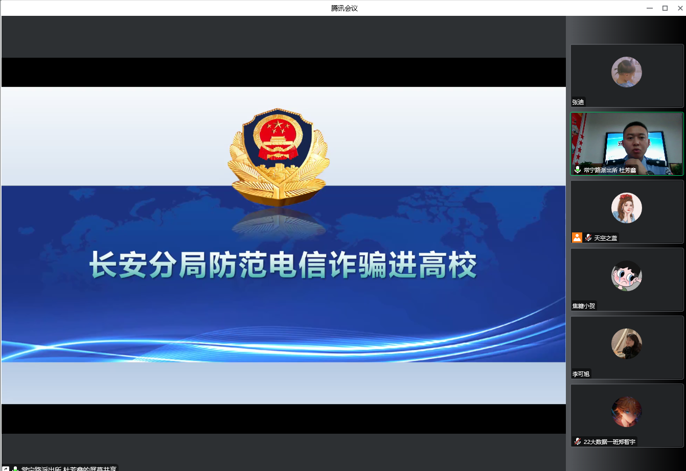 为进一步增强在校学生法制和安全观念,提高自我保护意识和能力,强化打击治理电信网络诈骗,对校园安全稳定工作做到预警防范。9月21日,信息工程学院在积学楼A202携手常宁路派出所开展“长安分局防范电信诈骗进高校”活动,召开了“安全教育大会”。会议邀请常宁路派出所杜芳鑫警官主讲,本次大会由新生辅导员主持,采取“线上与线下”相结合的形式,学工办主任和辅导员及2022级全体学生参加。