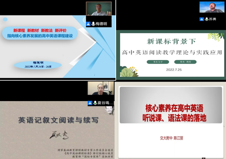 来自上海外国语大学的博士生导师梅德明教授以“新课程、新教材、新教法、新评价——指向核心素养发展的高中英语课程建设”为题进行报告,深入分析了新高考对高中英语教学提出的新要求,以及教师如何进行课程建设;山东鲁东大学硕士生导师苏勇教授围绕“新课标理念下高中英语阅读教学理论与实践应用”进行了详细的分类阐述并给出示例;杭州外国语学校特级教师夏谷鸣老师就“高考新题型读后续写”,以案例分析的方式进行了深入阐述与讲解;西安交通大学附属中学陈江丽老师为学员们介绍“核心素养在高中英语听说课、语法课的落地”,丰富了学员们的实践知识,增强了学员们运用可视化工具提升教学水平的能力;我院张琛睿老师从高中英语教师的需求出发,与老师们一起探讨了现代教育技术在英语教学中的应用方法和策略,为学员们指点迷津。专家们的报告高屋建瓴、内容丰富、理论联系实际,开阔了参训教师的视野。