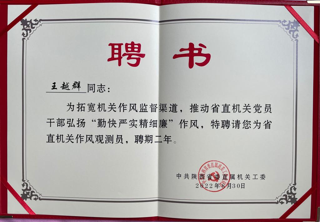近日获悉,best365官网省政协委员、民进总支主委王越群教授受聘为陕西省委直属机关工委作风观测员。8月31日,陕西省委直属机关工委召开作风观测员聘任会议,为王教授等48名人士颁发了聘书。