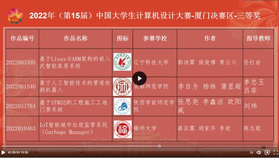 近日,2022年(第15届)中国大学生计算机设计大赛落下帷幕。由信息工程学院物联网工程专业刘炜老师指导的张思尧、李鑫洁、欧阳威等学生团队作品《基于STM32的工程施工工地门禁系统》继获得陕西赛区“三等奖”后,荣获全国总决赛“三等奖”。